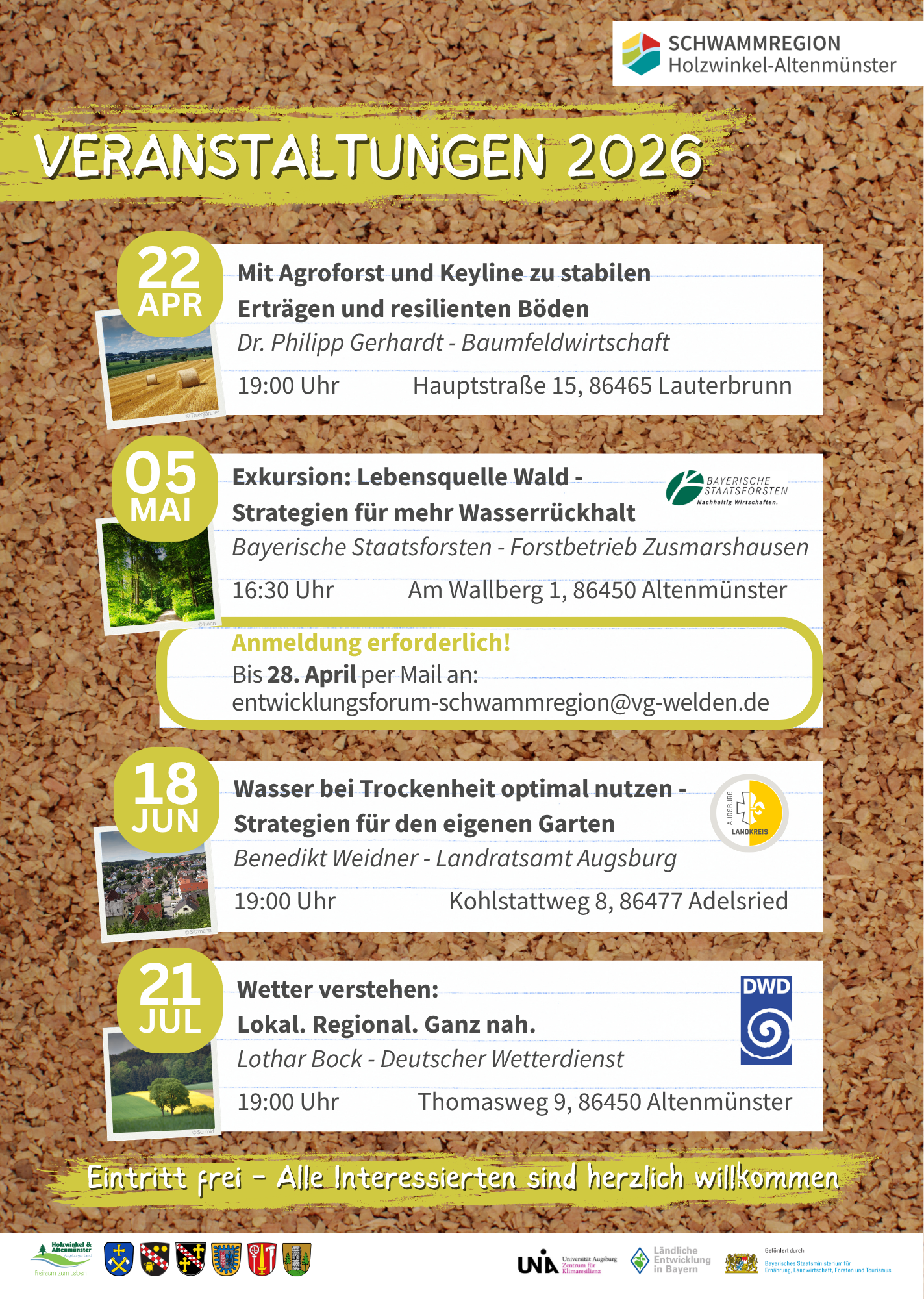 Im Rahmen des Modellvorhabens fördert das StMELF für fünf Jahre Personal für die Begleitung und Umsetzung von Projekten und Maßnahmen im Themenfeld der Schwammregion Holzwinkel-Altenmünster. Im März 2025 fand der offizielle Auftakt des StMELFs statt. Mit dem Arbeitsbeginn von Frau Dr. Julia Tammer kann das Projekt Schwammregion nun auch in der Region Holzwinkel-Altenmünster starten – genau ein genau ein Jahr nach dem Starkregenereignis vom Juni 2024. Seit September 2025 Frau Anna Strobl im September 2025 die Arbeit angetreten hat, ist das Team komplett.